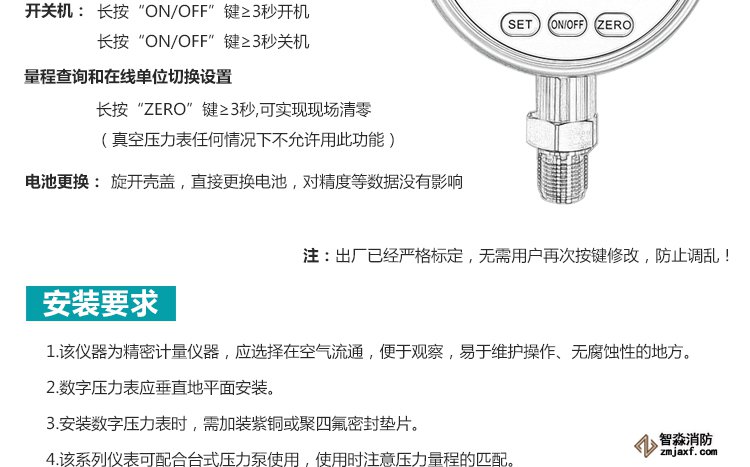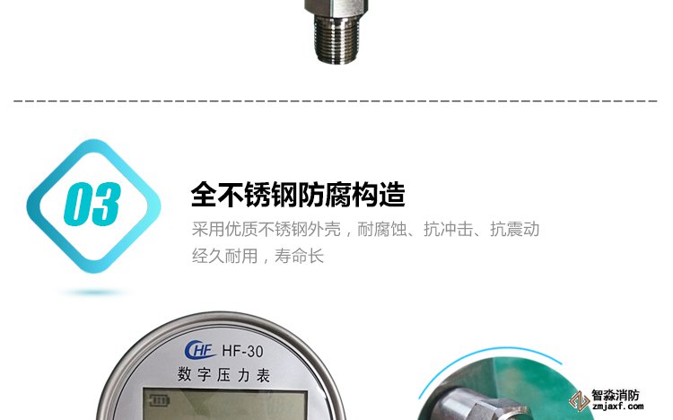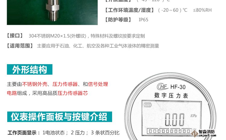 數字壓力表量程0-20MPa,精度0.4級測試消火栓用30. 細水霧末端試水裝置壓力表量程:0MPa~0.6MPa;精度:0.4級安裝在系統管網或分區管網的末端,檢驗系統啟動。