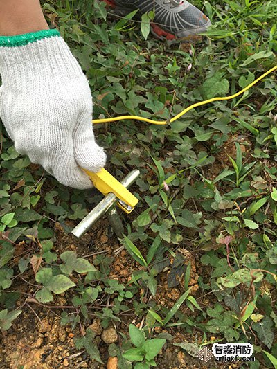把接地棒打到土壤下,線上有鉗子的一端鉗住接地棒,還要再打三根接地棒。共:紅,黃,綠,黑四根線。接地線的按照H,S,ES,E順序成一直線排列,每個接地棒之間距離為5米