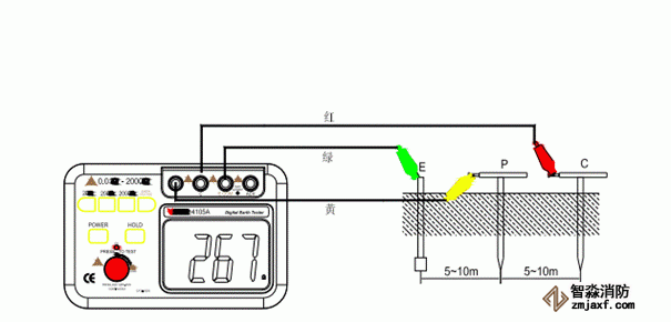 如下圖所示,將輔助接地棒P及C相距被測接地物間隔5至10米處以直線打入地下,將綠色線連接至儀器端子E,黃色導(dǎo)線連接至端子P及紅色導(dǎo)線連接至端子C。