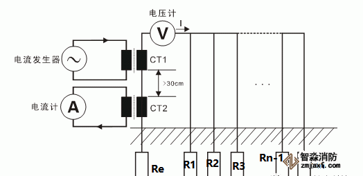 雙鉗法測量接地電阻值(適用于多獨(dú)立點(diǎn)并聯(lián)接地系統(tǒng)不打輔助地樁測量),通過激勵鉗CT1產(chǎn)生一個交流電動勢V,在交流電動勢V的作用下在回路中產(chǎn)生電流I,再通過CT2檢測到反饋的電流I,并根據(jù)公式R=V/I計(jì)算出電阻值,圖中R=Re+R1//R2//R3//…Rn-1//Rn,當(dāng)R1//R2//R3//…Rn-1//Rn(多個接地點(diǎn)并聯(lián)后的阻值)遠(yuǎn)小于Re,有R≈Re。