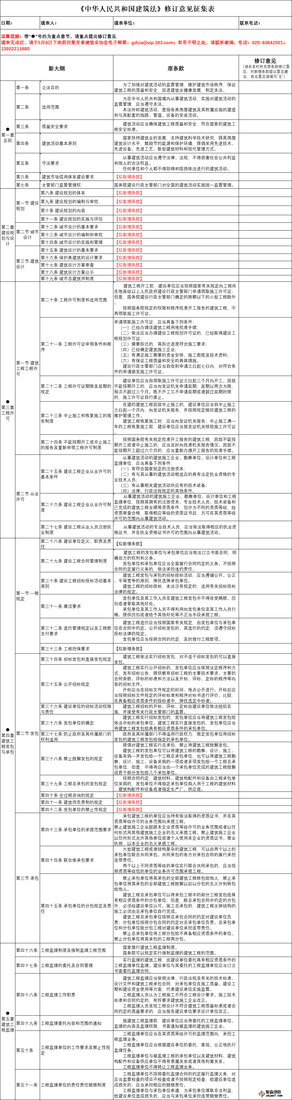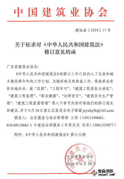 現將中國建筑業協會《關于征求對〈中華人民共和國建筑法〉修訂意見的函》(建協函〔2020〕17號)轉發給你們,請根據文件要求組織相關人員,重點就《中華人民共和國建筑法》“總則”、“工程許可”、“建筑工程發包與承包”、“建筑工程監理”、“建筑安全生產管理”、“建筑工程質量管理”、“職業健康”、“法律責任”等八個章節提出修訂意見和建議,其他章節修訂意見亦可一并提出,將 《中華人民共和國建筑法》修訂意見征集表(附件2)于5月8日前發送至我協會郵箱,由我協會匯總后報送至中國建筑業協會,感謝大力支持!