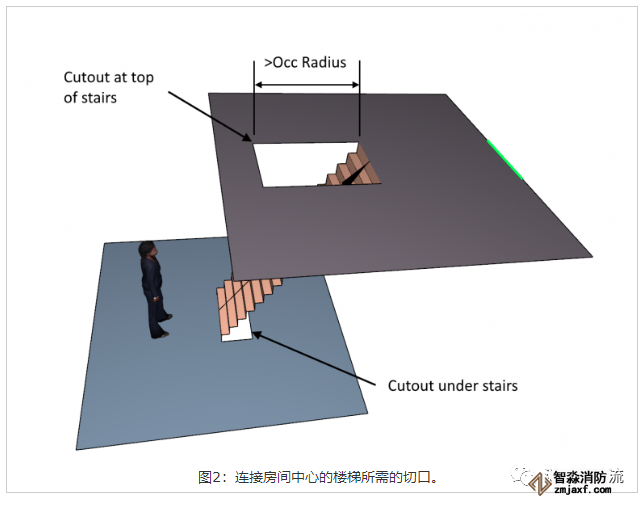圖1顯示了普通樓梯。樓梯的每一端必須連接到房間的邊界。如果樓梯連接房間的內部,則必須在頂部和底部使用切口,如圖2所示。頂部切口必須大于乘員半徑,并且樓梯不能真正垂直,必須有一定的坡度。步行表面自然定義為樓梯的頂表面。