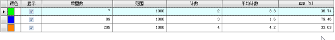 以1×10-2 mg/L Be、In、Bi、混合溶液進(jìn)樣,測(cè)量質(zhì)量數(shù)9,115,209處的離子計(jì)數(shù),在20min內(nèi),每2min取一個(gè)數(shù)據(jù),重復(fù)測(cè)量不少于10個(gè)數(shù)據(jù),計(jì)算相對(duì)標(biāo)準(zhǔn)偏差RSD,即為儀器短期穩(wěn)定性。