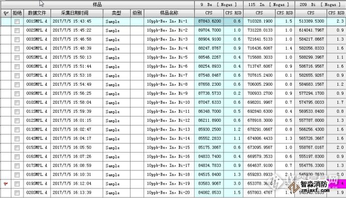 以2%高純硝酸溶液進(jìn)樣,測(cè)量質(zhì)量數(shù)9,115,209處的離子計(jì)數(shù),分別測(cè)量20個(gè)數(shù)據(jù),取其平均值。