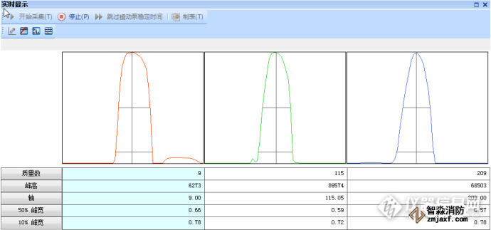 分辨率:以1×10-2 mg/L Be、In、Bi、混合溶液進(jìn)樣,打印質(zhì)量數(shù)9,115,209的譜圖,并計(jì)算10%峰高處的峰寬度。