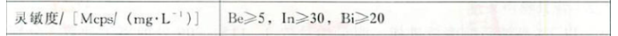 以1×10-2 mg/L Be、In、Bi、混合溶液進(jìn)樣,測(cè)量質(zhì)量數(shù)9,115,209處的離子計(jì)數(shù),積分時(shí)間0.1s,分別測(cè)量20個(gè)數(shù)據(jù),取其平均值,在除以其準(zhǔn)確濃度值,即為個(gè)元素的靈敏度S。