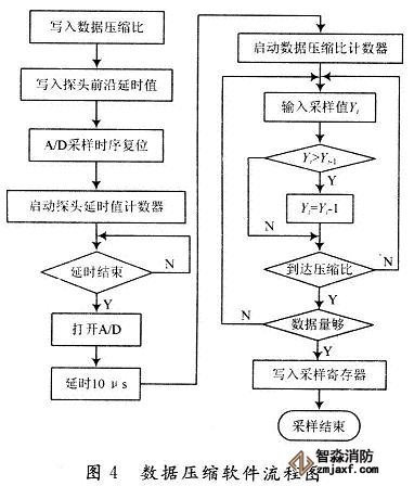 數據壓縮處理是對射頻信號高速采樣后進行前置處理的重要環節之一,需要在保持超聲回波信號基本特征前提下對采樣數據進行在線壓縮,而且要求壓縮后的數據與原始采樣信號的包絡相吻合。為此,在每次壓縮過程中,只取采樣所得的最大值,而舍棄其他采樣值。FPGA將計算所得采樣數據的壓縮比、探頭前沿延時計數值等數據送入相應的鎖存器,然后發出時序復位命令并發射,啟動探頭延時計數,延時到后啟動A/D采樣,同時壓縮比計數器開始計數,在時鐘信號的控制下,每采樣一次,壓縮比計數器減1,并將當前采樣值與前次采樣值比較,如大于則保存,否則舍棄,直至壓縮比計數到零后,得到一個有效的采樣數據。同時壓縮比計數器自動復位,重新開始計數,其工作流程如圖4所示。
