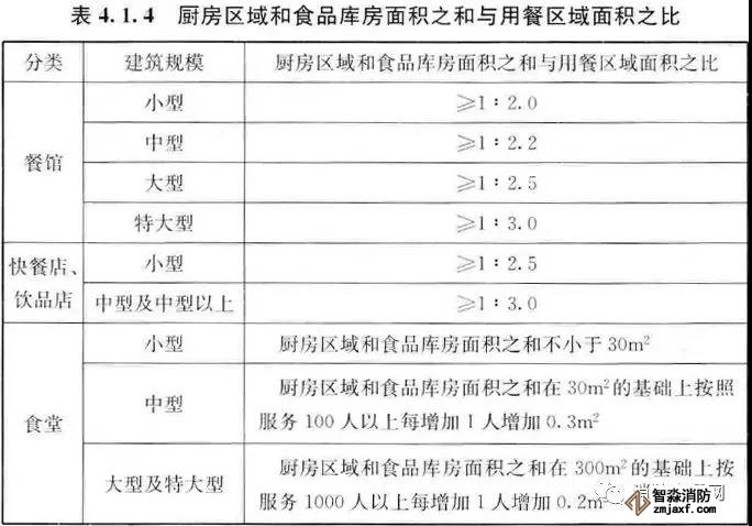 一、廚房區域和食品庫房面積之和與用餐區域面積之比宜符合表4.1.4的規定。(4.1.4)